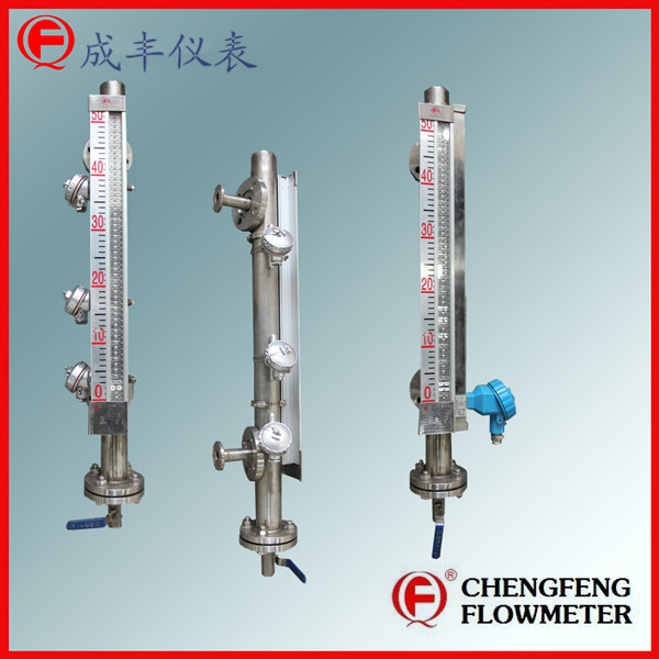 Level meter structure bases on the principle of bypass,the liquid lever in the main pipe is as same as that in the vessel device.According to Archimedes Theorem,the buoyancy force of magnetic float in the liquid is equal to the floater weight ,floater floats on the surface of liquid,the floater in the main pipe of level meter will move up and down with the movement of level in the vessel measured.The permanent steel magnet in the floater will turn 180° through the red-white turn post in the magnetic coupling drive indicator.When liquid lever rises, the turn post turns white side to red one,when the lever lowers,turn post turns red side to white one.The red and white interface of indicator is the actual height of media level in the vessel.Thus the level indication is realized.